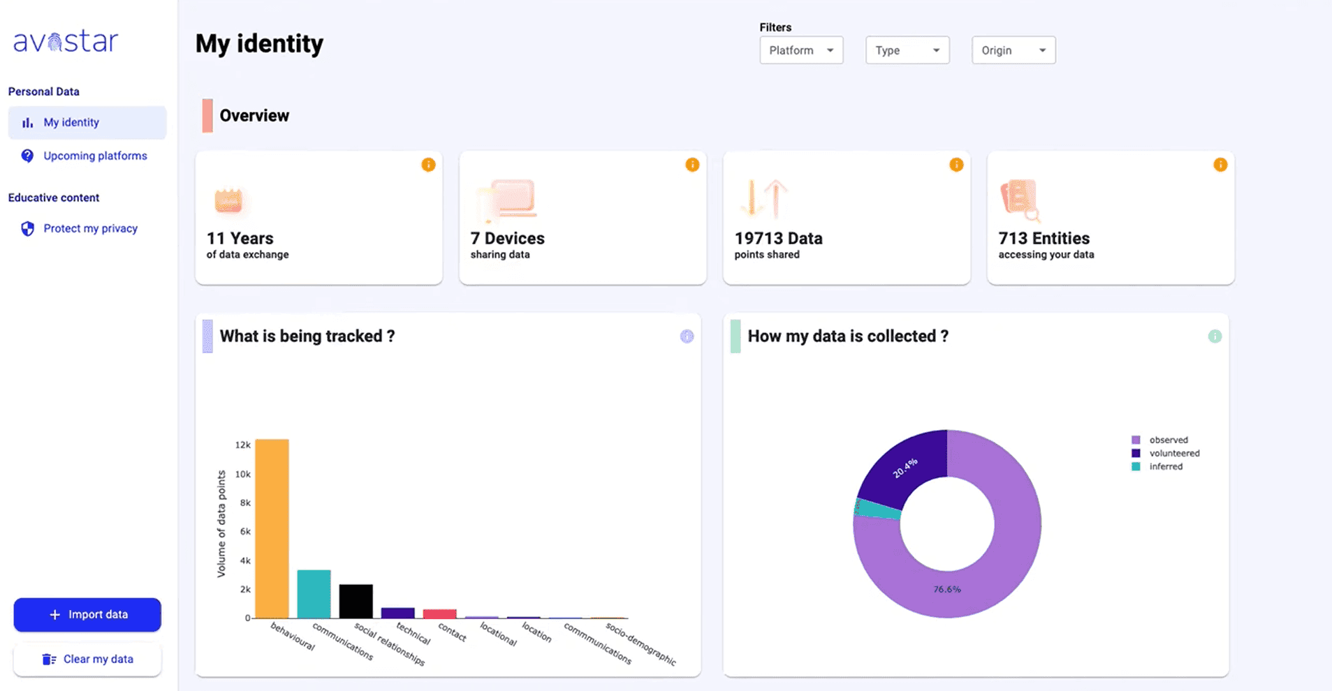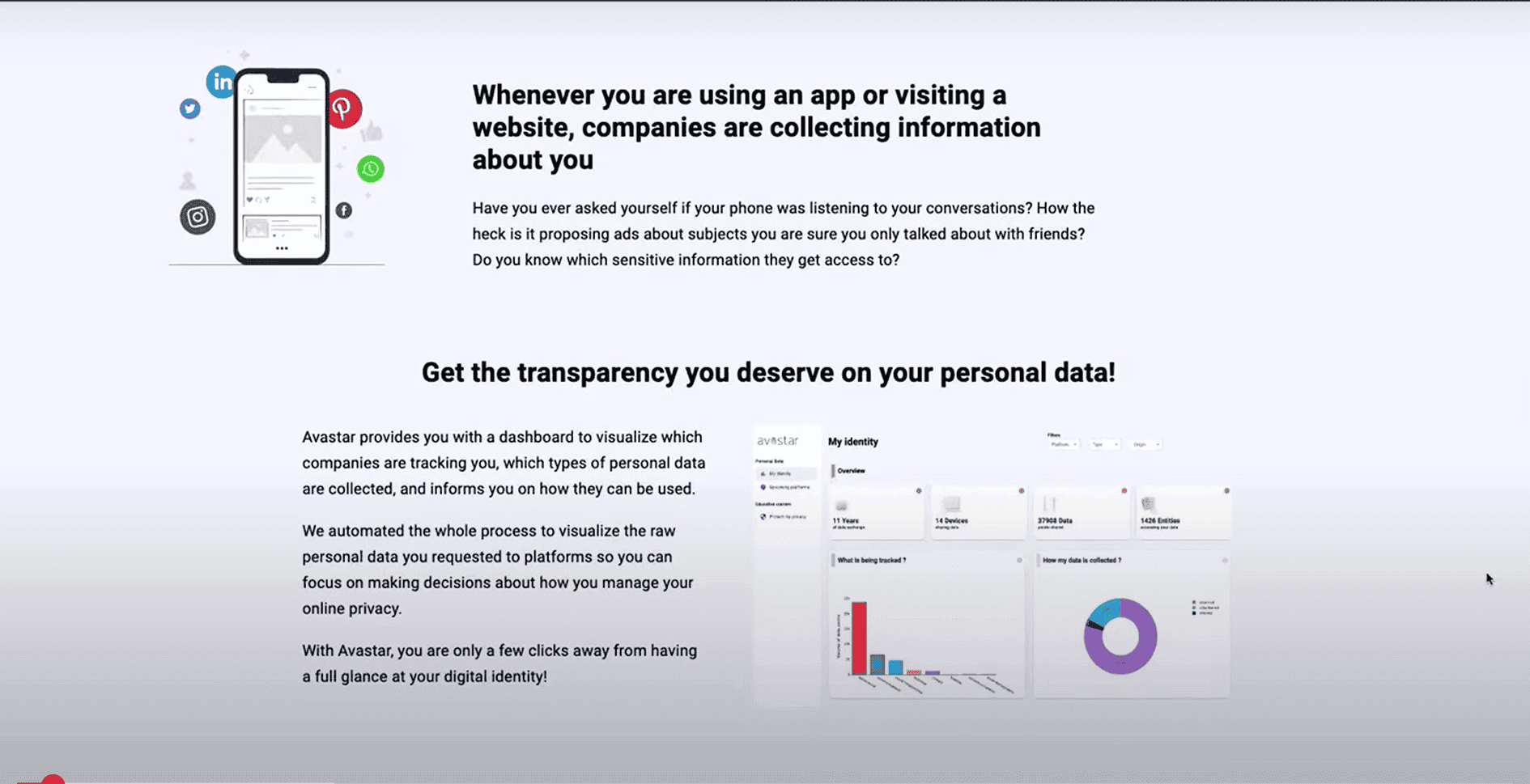 Avastar est une solution qui permet d'améliorer l'accès à la compréhension de son identité digitale. La webapp permet de créer une carte d'identité digitale visuelle à partir des informations personnelles téléchargées sur les différents plateformes, qui reprend l'ensemble de ces informations de façon digestes et compréhensible.