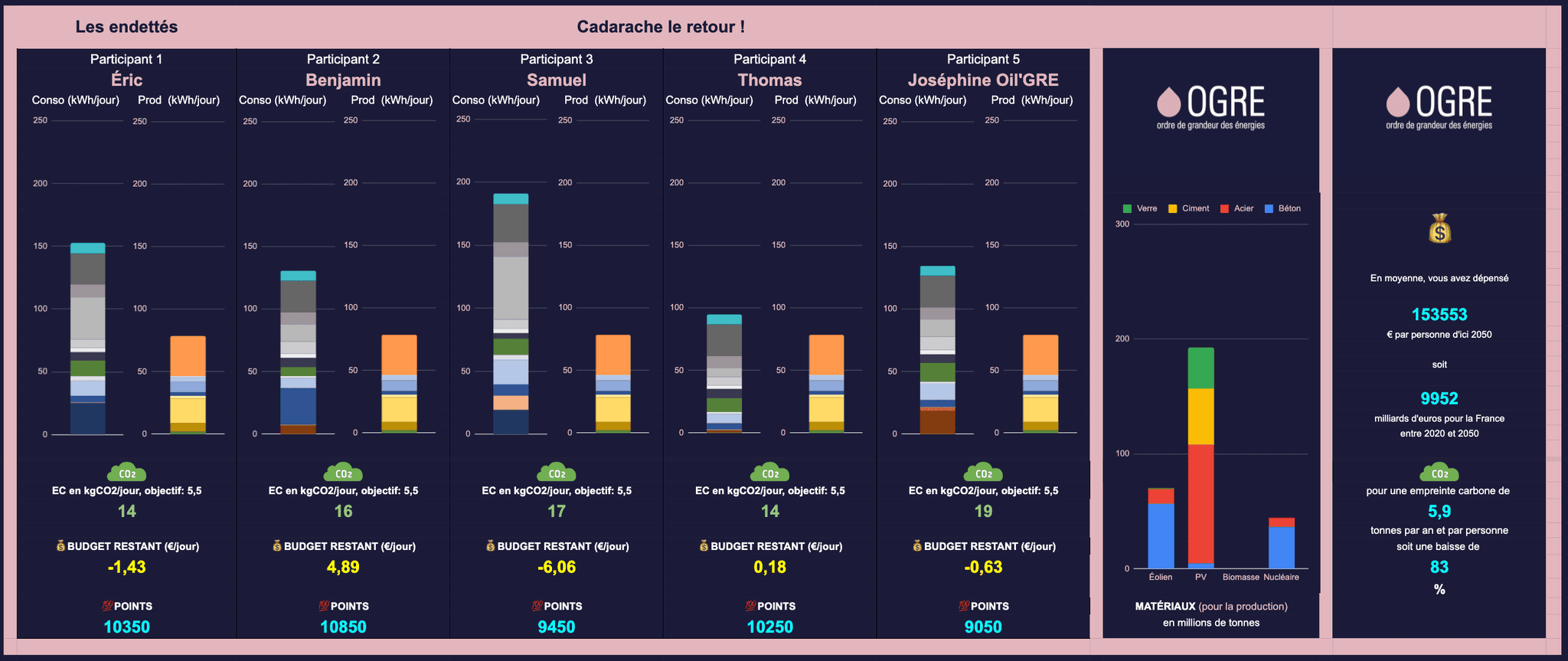 Les participants répartis en équipe de 4 à 8 personnes, et aidés par un animateur, disposent de 3h pour équilibrer consommation et production d’énergie décarbonée.